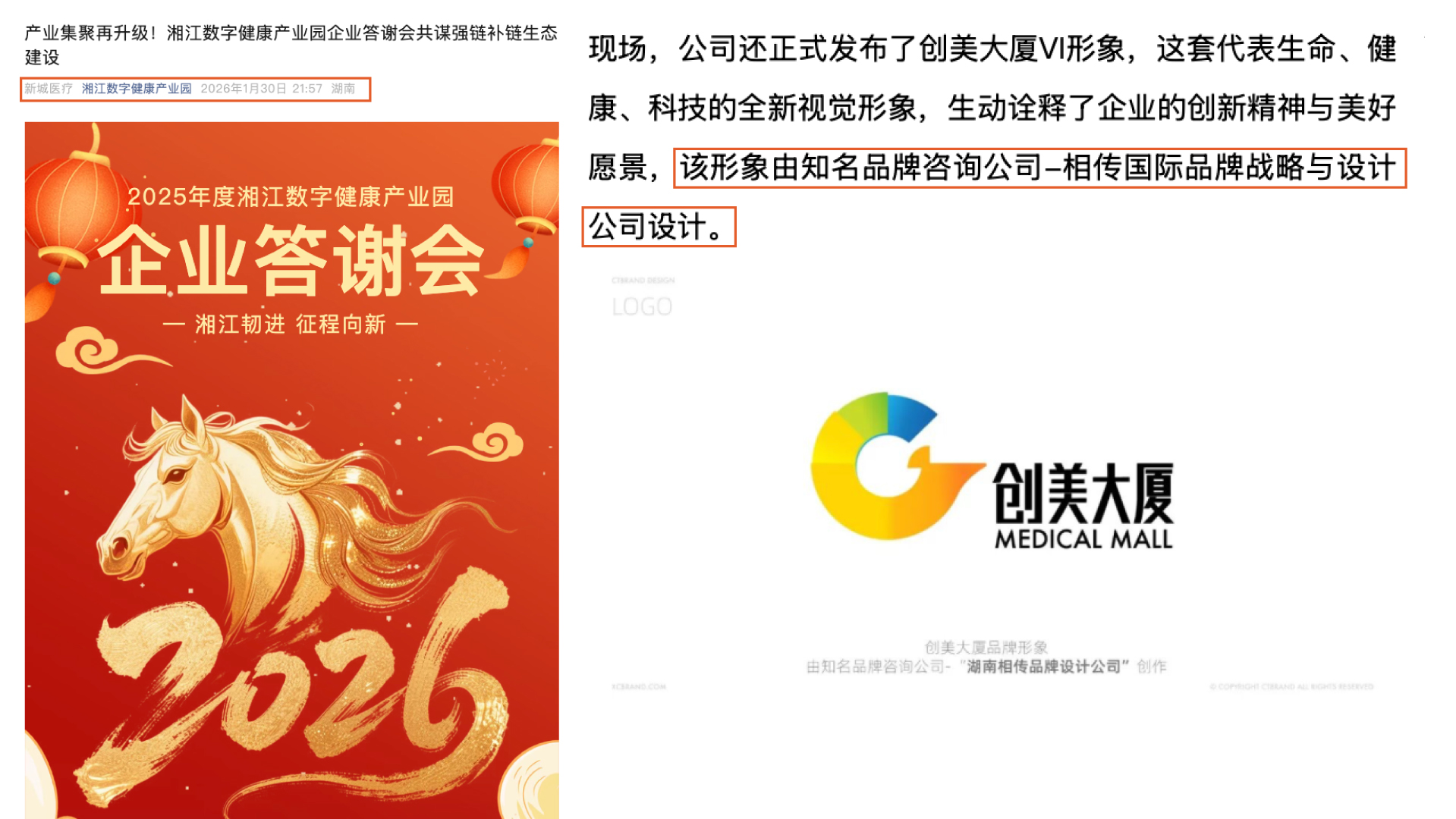 相传以凤凰图腾为品牌核心,融合生命橙黄、健康翠绿与科技蔚蓝,为这一国企地标构建了兼具国际美学与产业特性的品牌识别系统,并完成全流程导视设计。项目交付后,客户主动在官方微信公众号发布文章,明确标注“由知名品牌咨询公司湖南相传品牌设计有限公司创作”,成为相传专业实力的最佳注脚。客户名称 : 湘江集团旗下新城医疗-创美大厦