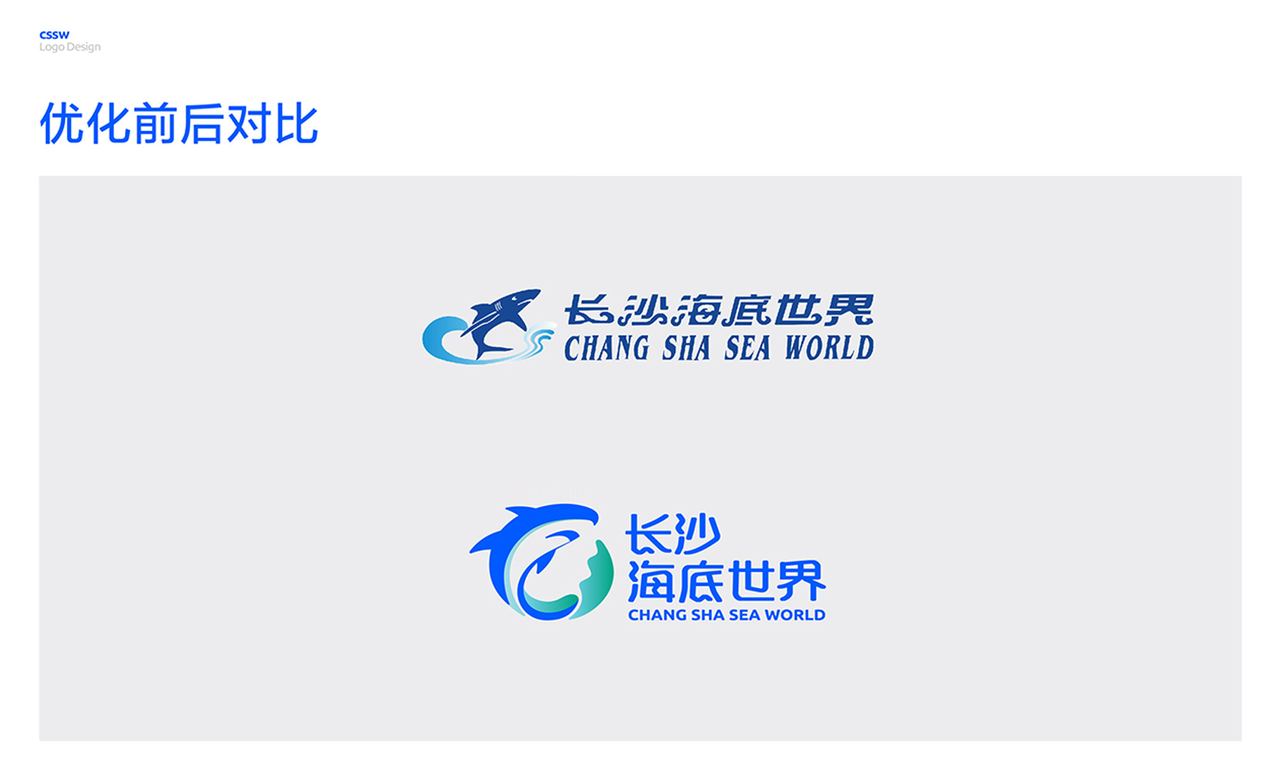 项目启动后,相传团队深入调研发现:长沙海底世界对外传播口号缺乏吸引力与传达力;Logo设计过于陈旧,鲨鱼与水的结合生硬、缺乏巧思,像是拼凑素材;字体设计不统一且过于花哨,难以适应现代数字化传播载体的要求。